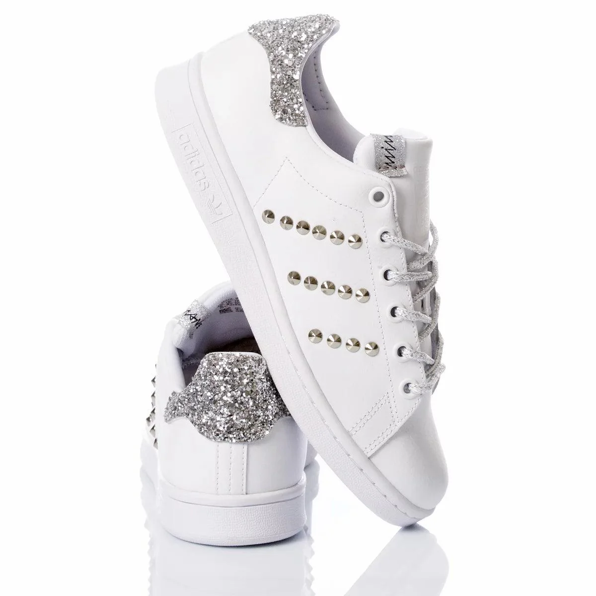 Sides with stripes of silver studs, back with silver glitter, silver laminated shoelaces, original white shoelaces.