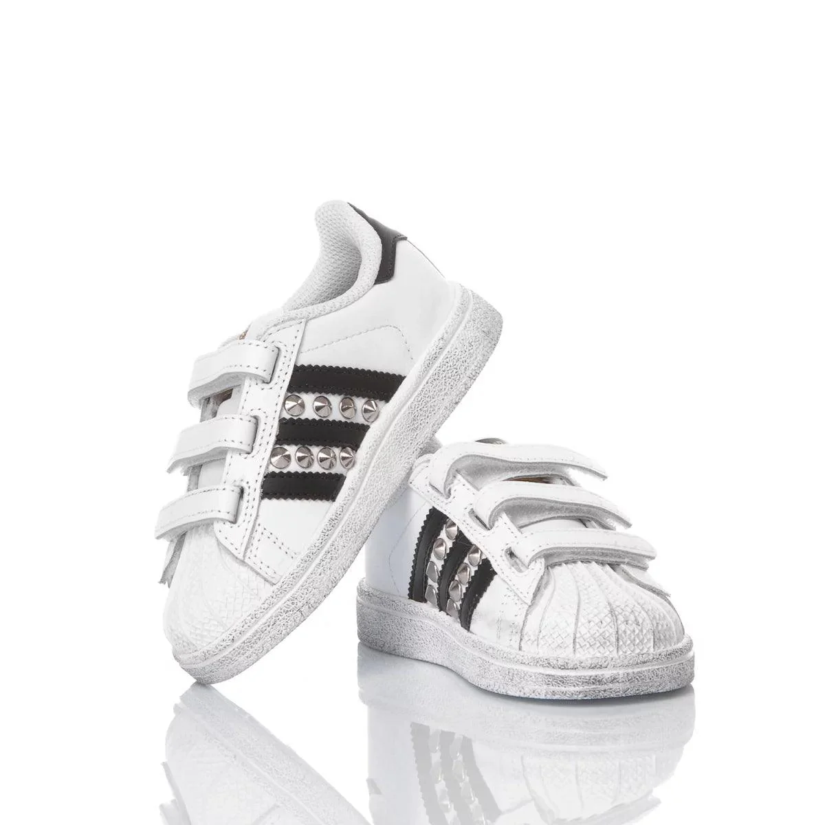 Adidas Superstar Baby London Silver, a shoe with a strong character, entirely studded in silver on the outside while on the inside the stud outlines the three classic adidas stripes, dirtied to give it the right vintage tone, this men's trainer also offered in baby allows you a matchy-matchy style with your little one.