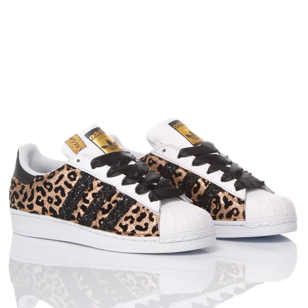 Adidas Superstar Leo Gold, an undisputed must-have, timeless and ageless and in fact after women's wear it is also available in smaller sizes, because nobody has to give up style. What more is there to say? Sides covered in leopard-patterned gold glitter fabric and the three classic adidas stripes in black glitter. With these women's trainers, your feet will be the centre of attention and will shine like never before. Adidas Superstar Leo Gold will come with black satin laces in addition to its white originals.