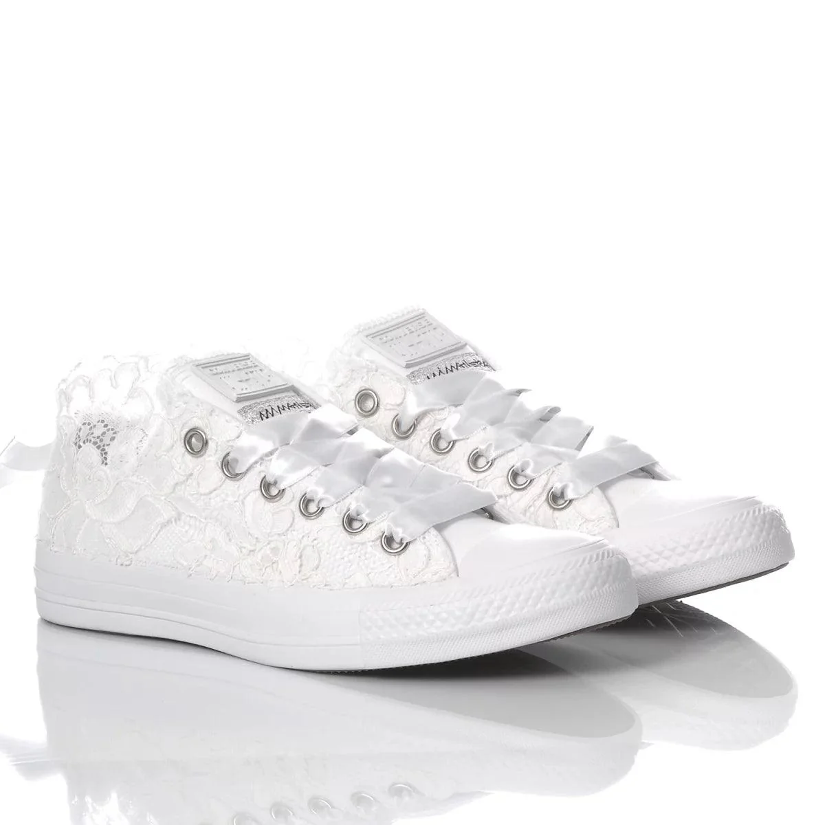 Converse All Star Amabel Ox, FINALLY!!! One of our 'must-haves' and, not for nothing among our favourites, has arrived in its low version. Covered in delicate lace with ankle detailing, a white satin bow on the back and, to top it all off, Swarovski crystals. What more could you want? Their whiteness will be perfect to accompany you every step of the way, even on your special day and every other time you want to wear them! Converse All Star Amabel Ox will come with white satin laces in addition to its white originals.