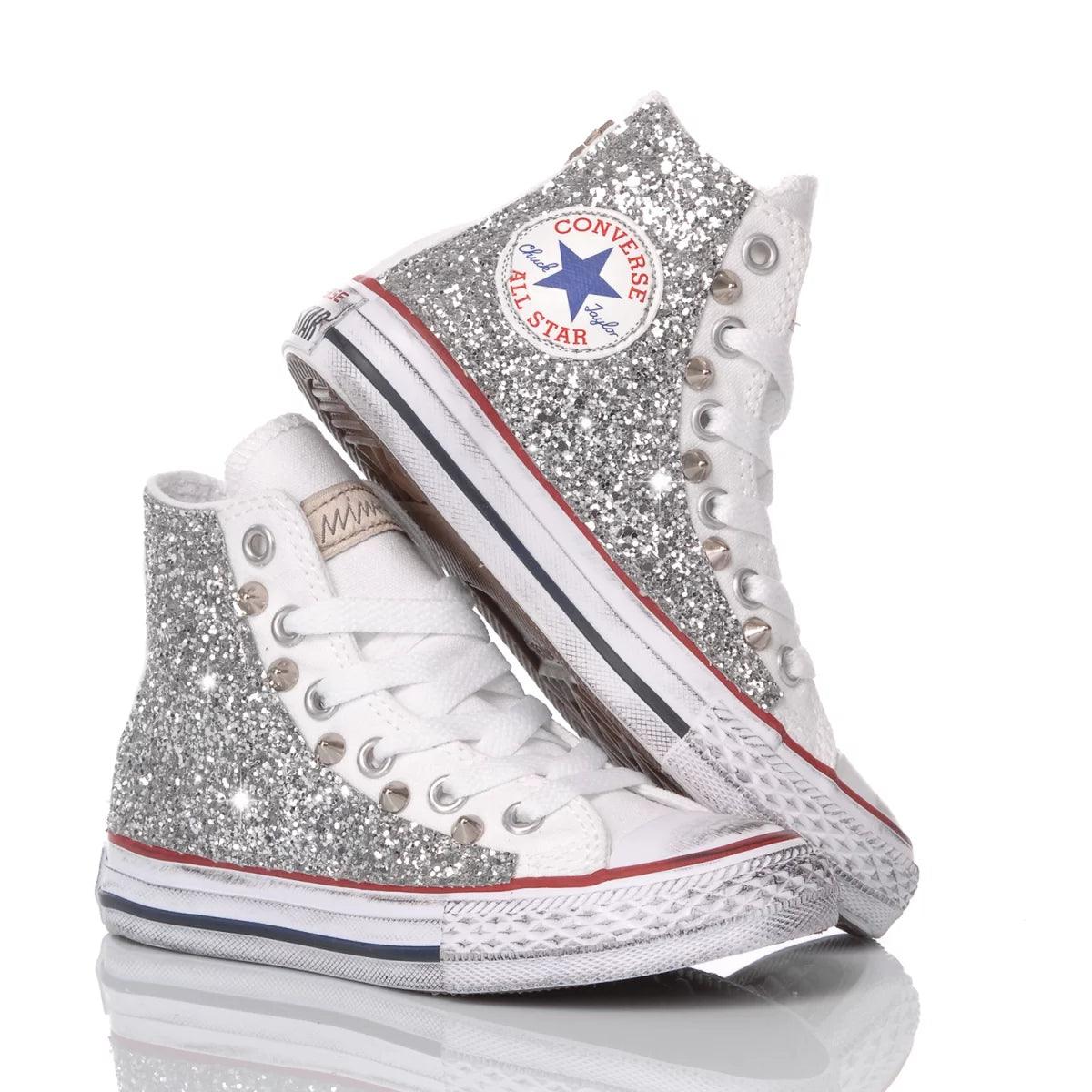 Converse All Star Junior Glitter Silver, a little girl's trainer with an all-new, distinctive look. Covered in silver glitter on both sides and finished with studs between the eyelets, so that her feet sparkle with every step. This model is also available for women for a perfect mother-daughter matchy-matchy style. The Converse All Star Junior Glitter Silver comes with its original white laces.