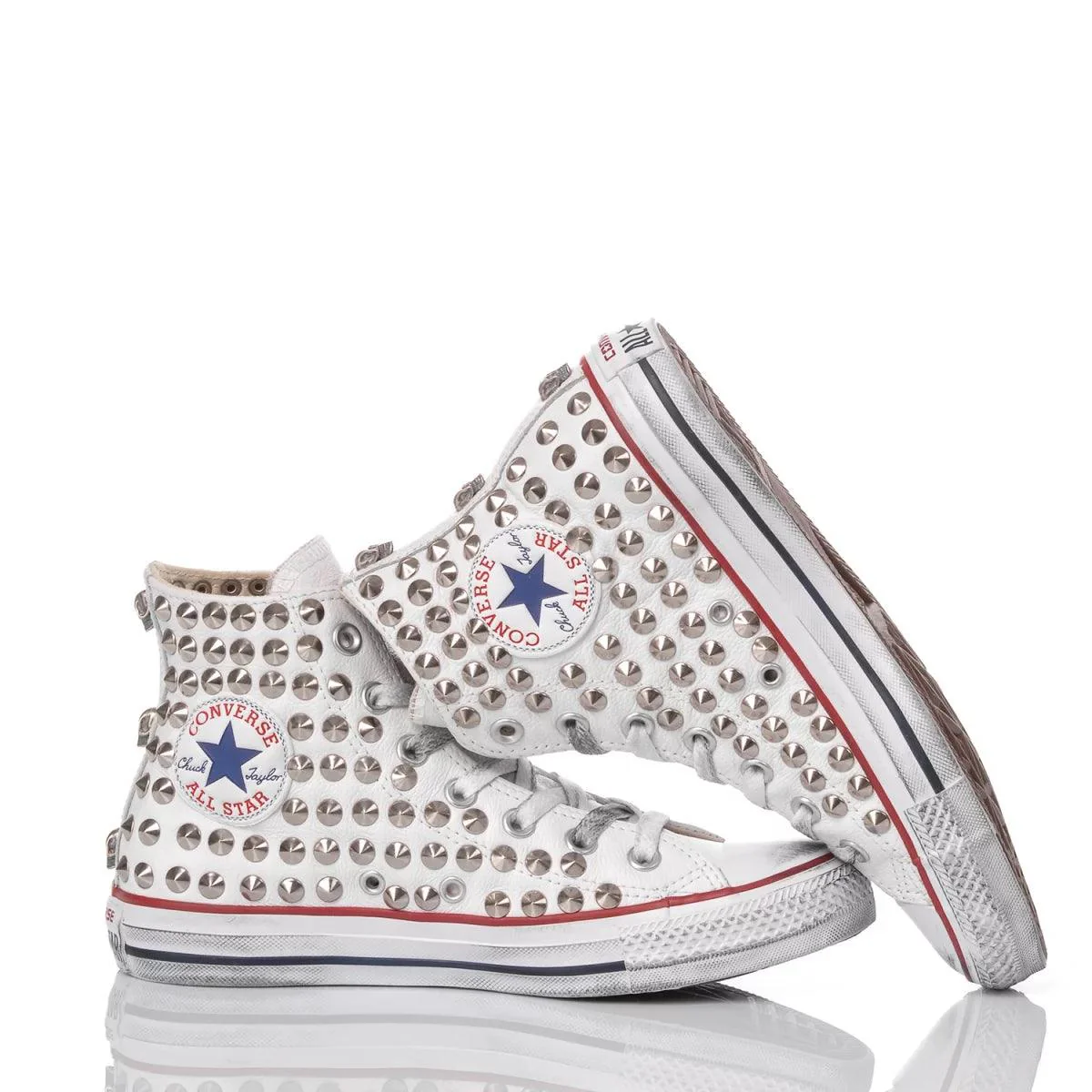 Converse All Star Pelle Borchie Bianca, un grande classico in casa Mimanera, per chi ci segue da tempo non servono descrizioni, ma rinfreschiamoci comunque la memoria: si tratta appunto della nostra classica sneakers, uomo e donna, nella versione alta, questa volta in pelle, sulla quale vengono applicate e fissate manualmente e meticolosamente le borchie, sporcata per darle il giusto tono vintage, il risultato è una scarpa dall'animo un po' rock, per dare la giusta sicurezza e grinta ad ogni tuo passo. La Converse All Star Pelle Borchie Bianca ti verrà fornita con i suoi lacci originali bianchi. Per un maggiore comfort ti proponiamo la nostra solette alzatacco che, oltre alla comodità, ti dona qualche centimetro in più ed uno slancio della figura immediato.