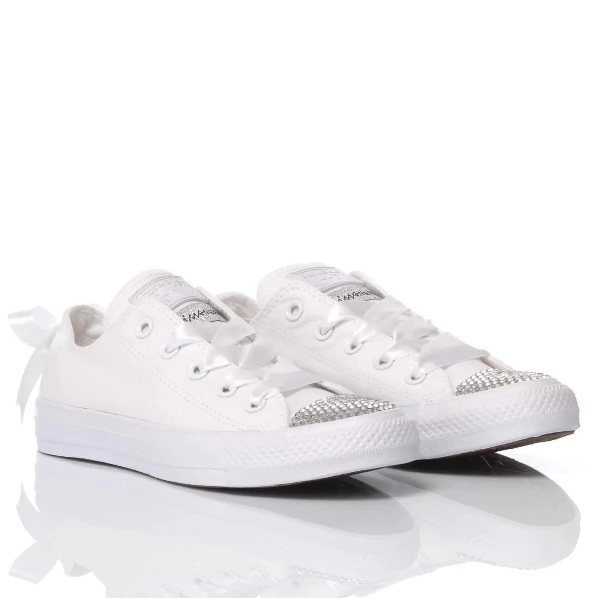 Top with Swarovski, back with satin ribbon and silver star, white satin shoelaces, white original shoelaces.
