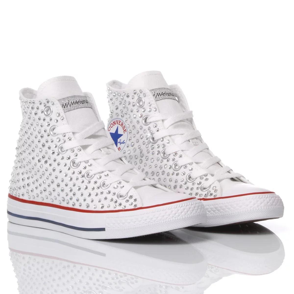 Converse All Star Swarovski Bianca, a great classic in the Mimanera house, for those who have been following us for some time there is no need for description, but let's refresh our memory anyway: this is precisely our classic women's sneakers in the tall version, on which Swarovski crystals are applied manually and meticulously one by one. The result is a shoe that can bring light to your every step, even on your most special day. The Converse All Star Swarovski White will be supplied to you with its original white laces. For even more comfort, we offer you our heel lift insole, which, in addition to comfort, gives you a few extra inches and an immediate figure boost.